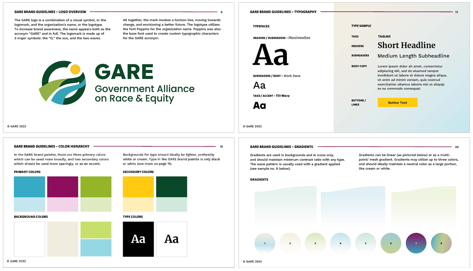 The new logomark builds around the letterform of a capital ‘G’, emphasizing the government aspect of the work. The symbol evokes waves of change moving toward a brighter future on the horizon. The updated color palette grew from the previous color palette, particularly keeping reference to GARE’s primary green. We amped up the vibrancy of the core colors and added new accents that brought a bolder and brighter look and feel.