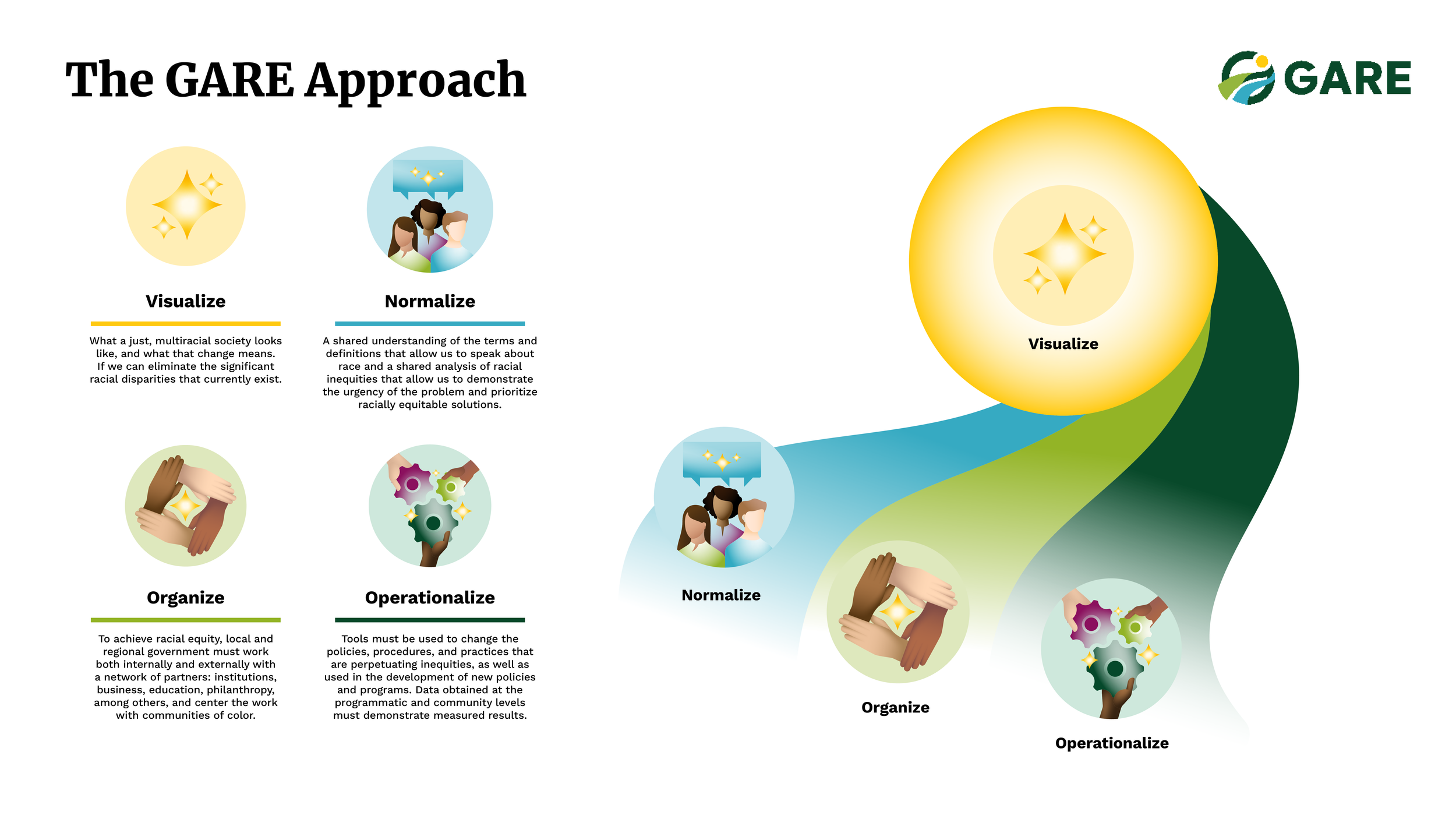 We created a set of branded graphics and templates for key communication materials. Central to the network is the GARE approach, an organizational change model for achieving racial equity in government. We designed a graphic to visually communicate the GARE approach, leveraging elements from the new logo and creating custom pictograms to represent the different aspects of the model. We also created custom graphics to visually represent the different steps of GARE’s Racial Equity Tool, a guiding process for proactively identifying opportunities to advance equity. Lastly, we designed new templates to support the ongoing creation of promotion graphics for key programming and events, e-newsletters, presentations, and reports.